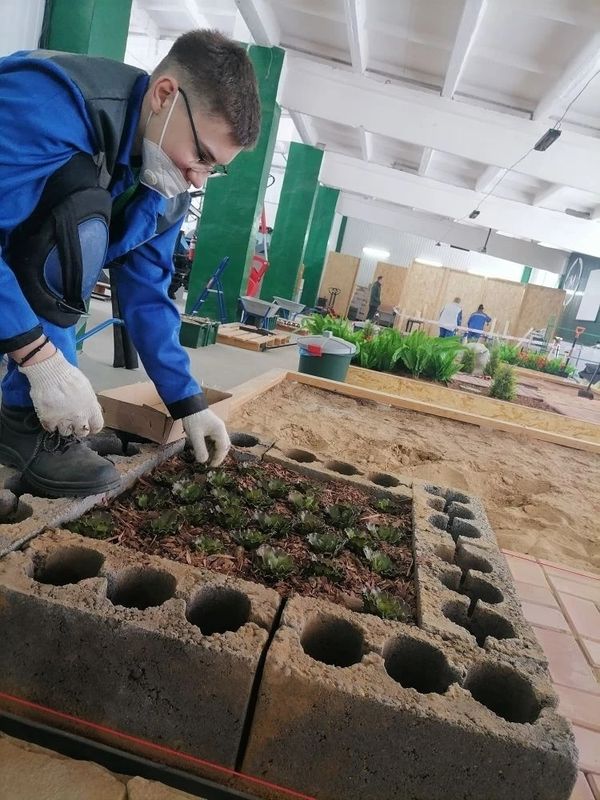 По компетенции "Ландшафтный дизайн" ребята выполняли модули по посадке насаждений, декоративной отсыпке и сборке конструкции.